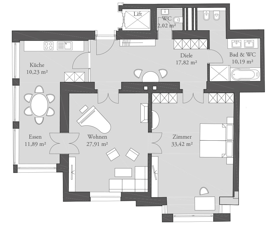 Treten Sie ein in diese herrschaftliche Zweizimmerluxuswohnung! Sie erwarten großzügige und helle Räumlichkeiten, ein Wohnerlebnis der Superlative mit reichhaltigen Stuckdecken und dem Luxus von heute.